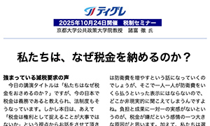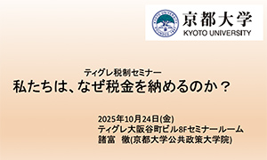 ティグレ税制セミナー「私たちは、なぜ税金を納めるのか?」開催 2025年10月24日(金)15時より、経済学者の諸富徹(もろとみとおる)京都大学公共政策大学院教授を講師にお迎えし、ティグレ連合会主催の税制セミナー「私たちは、なぜ税金を納めるのか? 複雑な税の仕組みから社会保障の未来まで、経済学の視点で解き明かす」を開催しました。 セミナー開催にあたり上田良子ティグレ連合会理事長より挨拶が行われ、講演が開始。諸富氏より、税の歴史から現在の状況、日本の税教育や今後の展望などが、多くのデータと共に丁寧にわかりやすく語られました。 上田良子ティグレ連合会理事長より挨拶 諸富教授の近著 本講演は、ティグレ大阪セミナールーム会場での開催に加え、オンライン同時配信でも多くの皆様にご参加いただき、質疑応答まで大変盛況となりました。 諸富氏より語られた本講演の主な内容・強まっている減税要求の声・払拭できない年貢的なイメージ・歴史から見る税金の成り立ち・税金は権利・教育方針に大きな変化の兆し・政治的有効感覚を持てない有権者・全世代の支援こそ社会保障の役割・社会保障財源を応能化するために・主権者として税金を払う 講演録および当日講演資料を掲載しています。以下より閲覧・ダウンロードが可能です。(新規タブで開きます) セミナー「私たちは、なぜ税金を納めるのか?」講演録/講演資料 講演録PDF 講演資料PDF 諸富 徹(もろとみ とおる)氏 京都大学公共政策大学院 教授【学歴・職歴】1993年 同志社大学卒業1998年 京都大学大学院博士課程修了1998年 横浜国立大学経済学部助教授2010年 京都大学大学院経済学研究科教授2015年4月~2016年3月 ミシガン大学グロティウス客員研究員【受賞歴】2014年 租税資料館賞/2021年 第11回不動産協会賞【著書】『税という社会の仕組み』(2024年 筑摩書房)、『税と社会保障』(2024年平凡社)、『私たちはなぜ税金を納めるのか』(2013年 新潮選書)等
